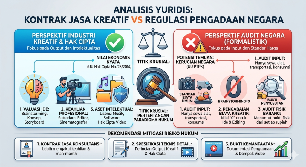 Pengabaian Hak Kekayaan Intelektual (HKI): Auditor menganggap biaya editing, brainstorming, dan storyboarding sebagai nol rupiah karena tidak ada bukti fisik nota pembelian barang. Padahal, Pasal 40 UU No. 28 Tahun 2014 tentang Hak Cipta secara tegas melindungi karya sinematografi sebagai ciptaan yang memiliki nilai ekonomi.
