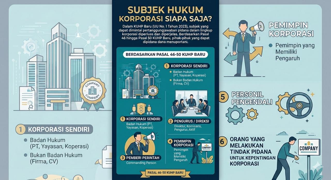 KUHP Baru memperjelas bahwa pertanggungjawaban pidana korporasi tidak hanya berhenti pada perusahaan sebagai entitas. Hukum juga dapat menjangkau berbagai pihak yang terlibat dalam pengambilan keputusan maupun pelaksanaan kegiatan perusahaan.